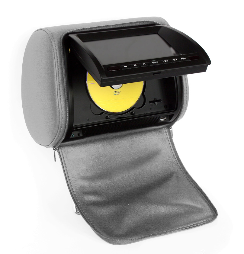 Комплект подголовников с LCD монитором 7" ERGO ER700H состоит из двух подголовников серого цвета, один из которых оснащен встроенным DVD-проигрывателем. Изюминкой данной модели является то, что подголовники имеют специальные чехлы с застежкой-молнией. Таким образом, когда чехол застегнут, подголовник выглядит как обычный и не привлекает постороннего внимания.