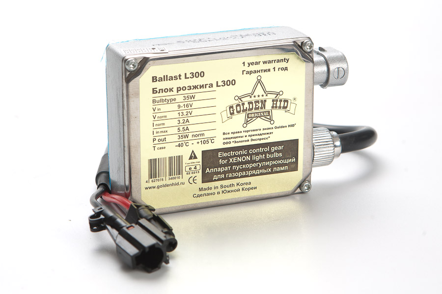 В комплект входит 2 блока розжига Golden HID L300. Это полностью герметичные разжигатели, которые прослужат вам не менее 2.000 ч. Среди основных преимуществ разжигателей Голден Хид — низкое потребление энергии и малая теплоотдача. Кроме того, эти блоки розжига оснащены защитой от короткого замыкания, защитой от подключения без лампы, защитой от обратной полярности и встроенным стабилизатором. Все это избавит вас от целого ряда проблем и обеспечит бесперебойную надежную работу в течение всего срока использования комплекта.