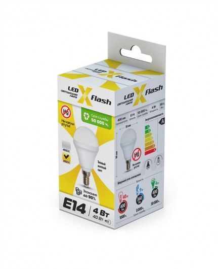 Светодиодная лампа X-Flash MINI E14 4W оптимально подходит для всех типов светильников, которые рассчитаны на лампы накаливания с таким цоколем. Колба модели матовая и имеет шаровидную форму. Алюминиевый радиатор led лампы способствует понижению температуры внутри нее, тем самым увеличивается срок службы. Данная модель рассчитана на напряжение 220 В. Мощность диодной лампы X-Flash — 4 Вт., яркость — 400 Лм, а температура свечения – 3000 K (это желтый свет).