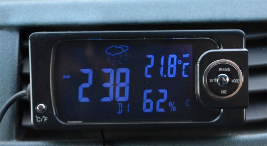Питание термометра осуществляется от батарейки. Два варианта цвета подсветки: синий и оранжевый цвет. Подсветка прибора работает от прикуривателя. Прибор имеет довольно компактные размеры: длинна 100 мм; высота 45 мм; ширина 19 мм, - и не будет перегружать пространство в автомобиле.