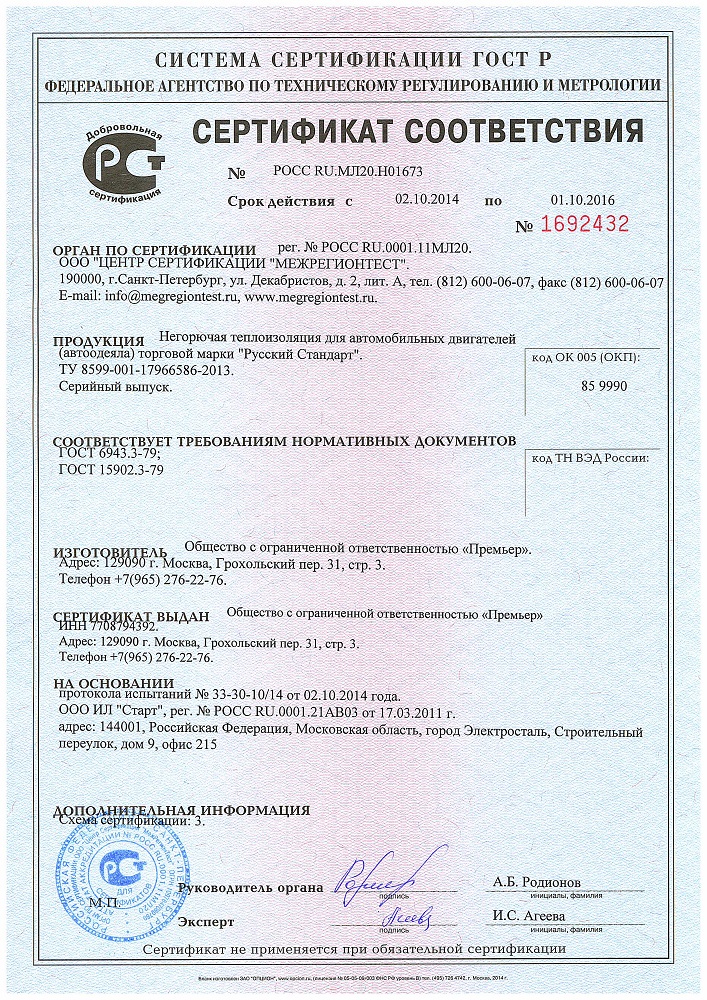 • Авто тепло «Русский стандарт» устойчиво к химической агрессивной среде и вибрации мотора. Это очень важно в российских условиях, т.к. зимой на дорогах без хим. реагентов попросту дело не обходится. Так что можете не волноваться, что через пару поездок автоодеяло придет в негодность. Оно прослужит вам очень долго!