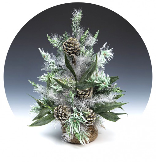 Оригинальная настольная елка в мешочке «Искристая фантазия» — это потрясающая новогодняя композиция из белой искусственной елки, зеленых листочков и настоящих еловых шишек. Стильно и необычно. Такая елочка станет замечательным украшением офиса в преддверии Нового года, создаст праздничную и домашнюю атмосферу. Искусственная ель высотой 0,46 м помещена в декоративный мешочек, что добавит еще больше оригинальности в оформление праздничного  интерьера.
