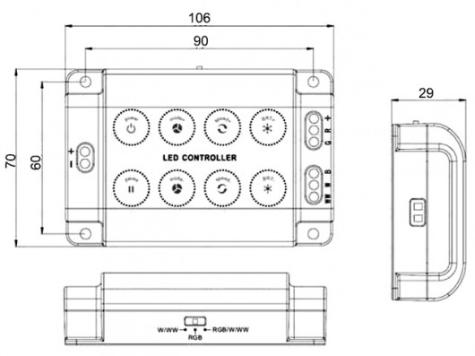 • Управление 5 каналами (RGB, White, Warm White) с помощью 8 кнопок на корпусе контроллера или с помощью пульта ДУ