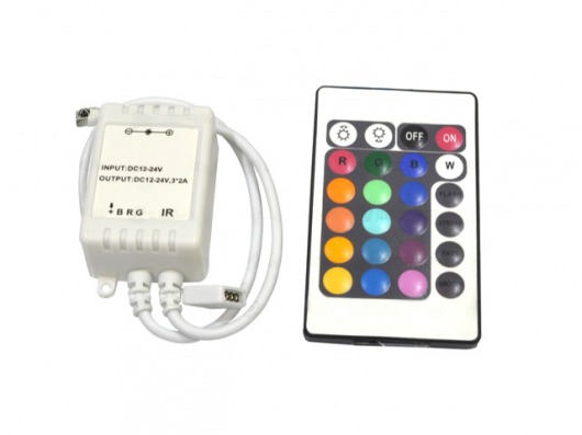 RGB-контроллер IR 24K с мощностью 72/144W позволит вам управлять свечением светодиодной ленты с помощью пульта ДУ через инфракрасный передатчик (в помещениях с прямой видимостью до 5 метров). Вы можете подключить ленту RGB с напряжением как 12V, так и 24V.