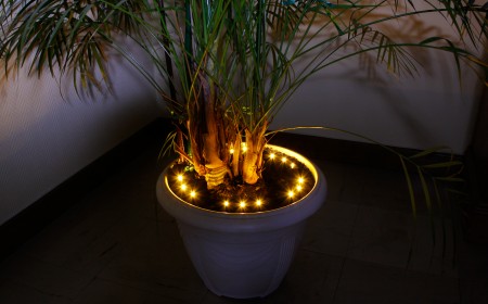 Светодиодная гирлянда для цветочного горшка сделана из 15 светодиодов тёплого белого свечения.  Если вы еще не знаете, как украсить комнатные растения к Новому году, такая световая гирлянда станет отличным решением. Она будет гармонично смотреться в цветочных горшках, создавая нежную подсветку.
