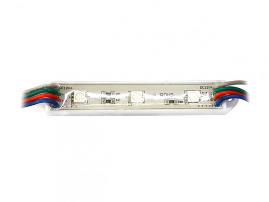 Линейный светодиодный модуль PL 5050-3 IP65 RGB — это 3 диода SMD 5050 цвета RGB и резисторы с рабочим напряжением 12V, которые находятся в пластиковом корпусе. Вы можете управлять модулем и создавать светодинамические эффекты с помощью RGB контроллера. Корпус залит двухкомпонентным компаундом. Поэтому вы можете использовать светодиодный модуль led в условиях  повышенной влажности и резкого перепада внешней температуры от  -30 до +50 градусов.
