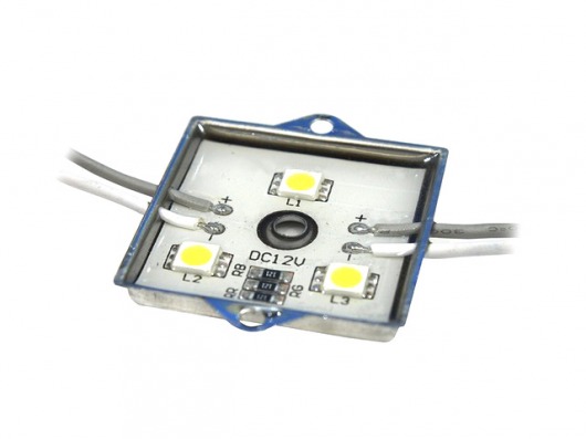 Квадратный светодиодный модуль MS 5050-3 IP65 3240Lm это 3 диода SMD 5050 и резисторы с рабочим напряжением 12V, которые находятся в металлическом корпусе. Яркость 1 диода составляет 54Lm, а всей упаковки — 3240Lm, что дает вам очень яркое и насыщенное свечение. Корпус залит двухкомпонентным компаундом. Поэтому вы можете использовать светодиодный модуль led в условиях  повышенной влажности и резкого перепада внешней температуры от  -30 до +50 градусов.