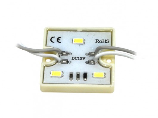 Квадратный светодиодный модуль PS 5630-3 IP65 6600Lm — это 3 диода SMD 5630 холодного белого цвета и резисторы с рабочим напряжением 12V, которые находятся в пластиковом корпусе. Яркость 1 диода составляет 110Lm, а всей упаковки — 6600Lm, что дает вам очень яркое и насыщенное свечение. Корпус залит двухкомпонентным компаундом. Поэтому вы можете использовать светодиодный модуль led в условиях  повышенной влажности и резкого перепада внешней температуры от  -30 до +50 градусов.