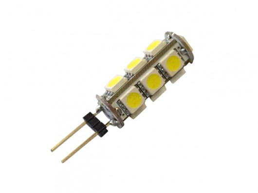 Светодиодная лампа G4/13-5050 с 13 светодиодами SMD 5050 и напряжением 10-30V это отличная альтернатива галогенным лампам и лампам накаливания с цоколем G4. Яркость данной лампы составляет 12-15 Лм на 1 диод. А потребляемая мощность — всего 15 Вт! Цвет свечения лампы — холодный белый.
