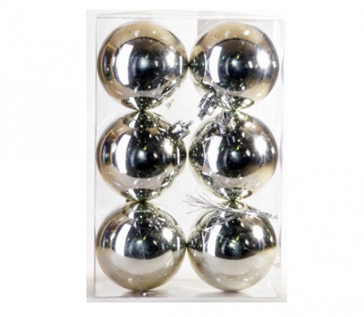 В набор PeneriGifts входят 6 серебристых елочных шаров с глянцевой поверхностью. Двух-трех таких наборов будет вполне достаточно, чтобы нарядить комнатную елку.