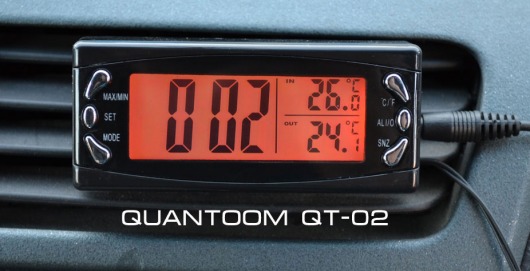 Quantoom QT-02 — это автомобильный термометр с 2 вариантами подсветки, который измеряет температуру и внутри, и снаружи вашего автомобиля. Питание термометра происходит от батареек, благодаря чему вы избавите себя от лишних проводов в салоне автомобиля.