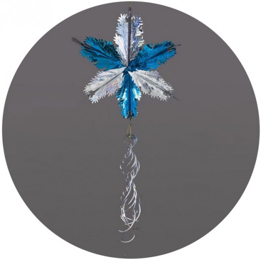 Голографическая бирюзово-серебряная звезда из фольги с подвеской — прекрасный вариант эффектного и недорогого новогоднего украшения. Новогодняя звезда диаметром 30 см отлично подойдет для украшения уличных елок и просторных помещений. Такая звездочка смотрится очень нарядно, особенно при искусственном свете. А кроме того, она прочная и хорошо хранится, и поэтому будет радовать вас еще много лет.