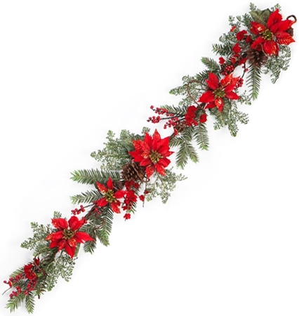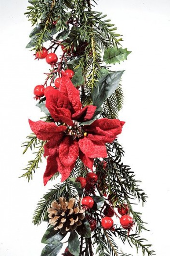 Новогодняя гирлянда с красными пуансеттиями создаст неповторимое рождественское настроение в вашем доме или офисе. Елочная гирлянда длиной 1,52 м украшена ярко-красными пуансеттиями — этот потрясающе красивый цветок, известный также под названием "рождественская звезда", стал во всем мире символом Рождества. В Европе пуансеттия уже стала неотъемлемой частью рождественских праздников.