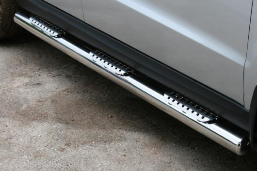 Пороги на Hyundai Santa Fe – это боковые подножки из нержавеющей стали диаметром 76 мм, которые позволяют более комфортно входить и выходить из салона автомобиля. Подножки Hyundai Santa Fe очень прочные, надежные и долговечные: они не боятся коррозии, сколов и царапин и выдерживают большие нагрузки.