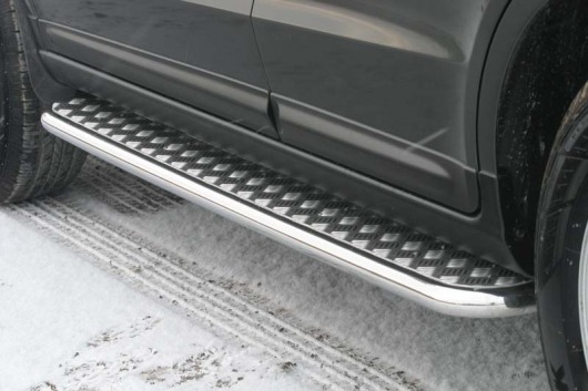 Пороги на Hyundai Santa Fe – это боковые подножки из нержавеющей стали диаметром 42 мм, которые позволяют более комфортно входить и выходить из салона автомобиля. Подножки Hyundai Santa Fe очень прочные, надежные и долговечные: они не боятся коррозии, сколов и царапин и выдерживают большие нагрузки.