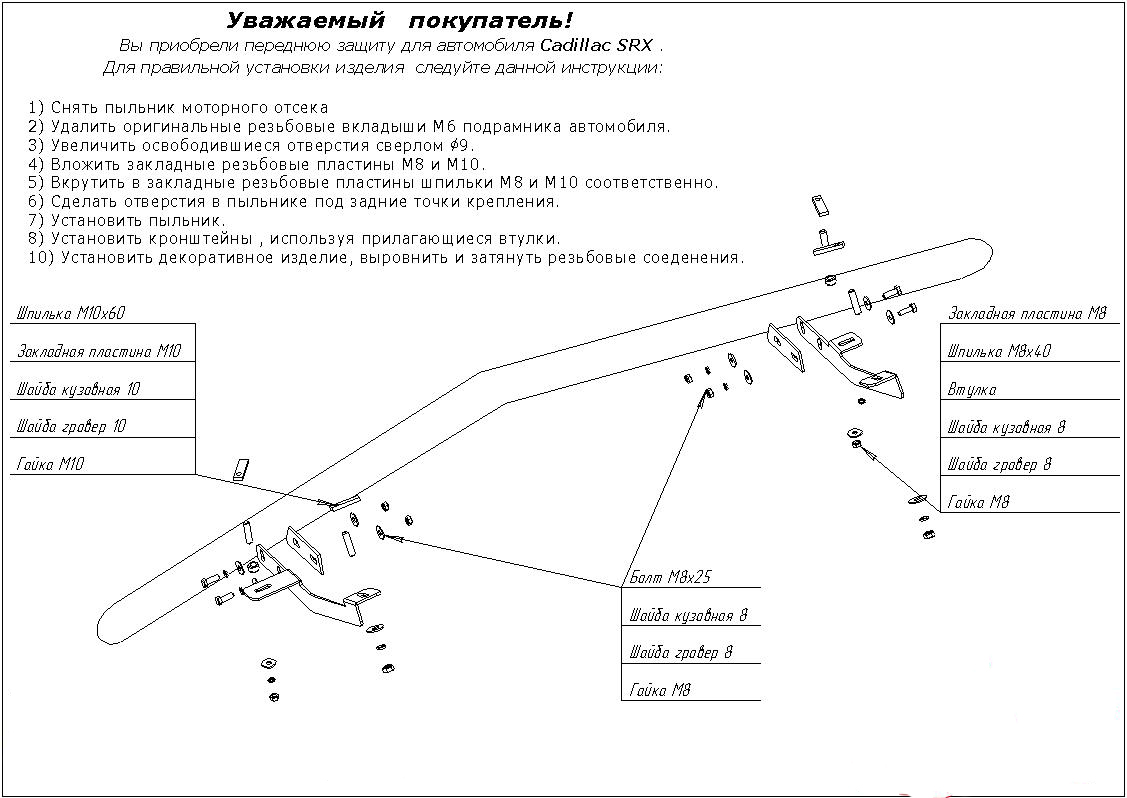 Защита переднего бампера труба предназначена для автомобилей Cadillac SRX 2007-2010 г.в. Вам не придется подгонять защиту под размеры бампера вашего авто. И с монтажом проблем не возникнет: установка защиты переднего бампера производится в штатные отверстия, а значит, необходимость сверлить кузов отпадает.
