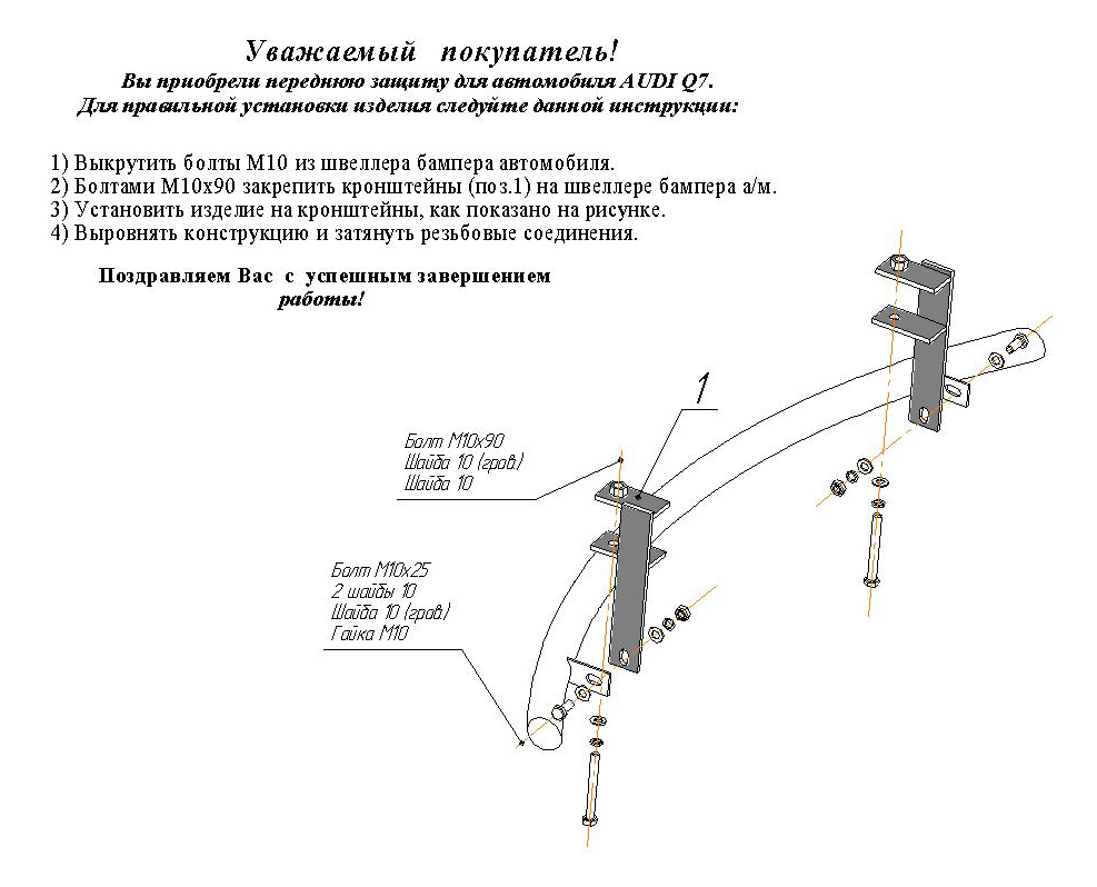 Защита переднего бампера труба предназначена для автомобилей Audi Q7. Вам не придется подгонять защиту под размеры бампера вашего авто. И с монтажом проблем не возникнет: установка защиты переднего бампера производится в штатные отверстия, а значит, необходимость сверлить кузов отпадает.