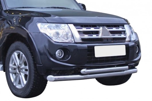 Защита переднего бампера для Mitsubishi Pajero IV – это двойная труба на бампер из нержавеющей стали диаметром 76/42 мм.