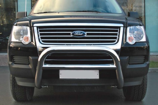 Защитная решетка переднего бампера предназначена для автомобилей Ford Explorer 2006-2010 г.в. Вам не придется подгонять передний кенгурятник под размеры кузова вашего авто. И с монтажом проблем не возникнет: установка кенгурятника Ford Explorer производится в штатные отверстия, а значит, необходимость сверлить кузов отпадает.