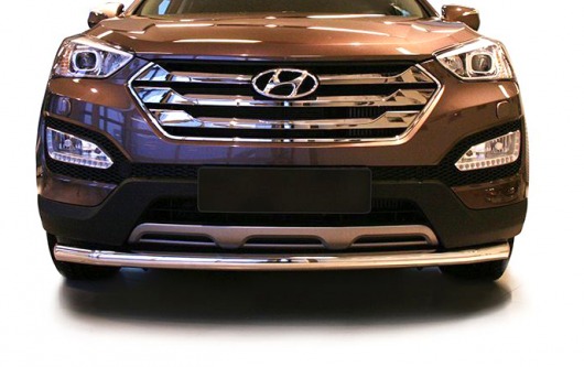 Защита переднего бампера труба предназначена для автомобилей Hyundai Santa Fe от 2013 г.в. Вам не придется подгонять защиту под размеры бампера вашего авто. И с монтажом проблем не возникнет: установка защиты переднего бампера производится в штатные отверстия, а значит, необходимость сверлить кузов отпадает.
