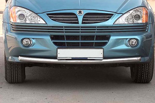 Защита переднего бампера труба предназначена для автомобилей SsangYong Kyron 2005-2006 г.в. Вам не придется подгонять защиту под размеры бампера вашего авто. И с монтажом проблем не возникнет: установка защиты переднего бампера производится в штатные отверстия, а значит, необходимость сверлить кузов отпадает.