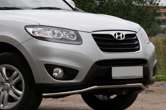 Защита переднего бампера труба предназначена для автомобилей Hyundai Santa Fe 2010-2011 г.в. Вам не придется подгонять защиту под размеры бампера вашего авто. И с монтажом проблем не возникнет: установка защиты переднего бампера производится в штатные отверстия, а значит, необходимость сверлить кузов отпадает.
