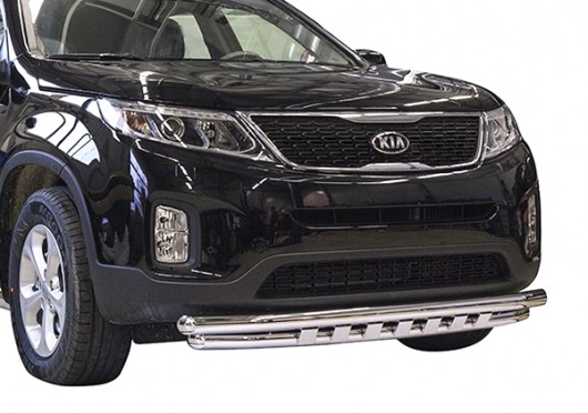 Защита переднего бампера для Kia Sorento – это двойная труба на бампер из нержавеющей стали диаметром 60/60 мм.