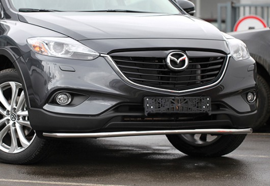 Защита переднего бампера труба Premium long предназначена для автомобилей Mazda CX-9 от 2013 г.в. Вам не придется подгонять защиту под размеры бампера вашего авто. И с монтажом проблем не возникнет: установка защиты переднего бампера производится в штатные отверстия, а значит, необходимость сверлить кузов отпадает.