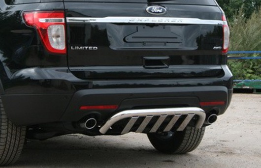 Защита заднего бампера труба с элементами из профиля предназначена для автомобилей Ford Explorer от 2011 г.в. Вам не придется подгонять защиту под размеры бампера вашего авто. И с монтажом проблем не возникнет: установка защиты заднего бампера производится в штатные отверстия, а значит, необходимость сверлить кузов отпадает.
