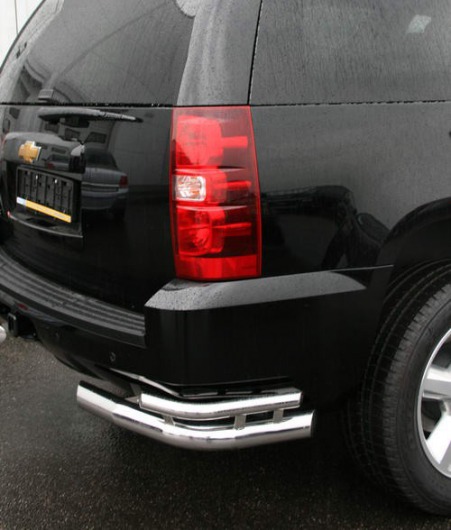 Уголки на задний бампер Chevrolet Tahoe защищают задний бампер автомобиля от различных механических повреждений при столкновениях на дороге и неудачных парковках. А кроме этого, защита заднего бампера для Шевроле — это дополнительная деталь тюнинга.