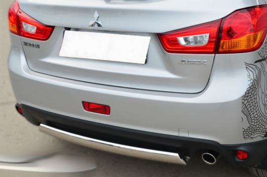 Труба на задний бампер Mitsubishi ASX защищает задний бампер автомобиля от различных механических повреждений при столкновениях на дороге и неудачных парковках. А кроме этого, защита заднего бампера для Митсубиси АСХ — это дополнительная деталь тюнинга.