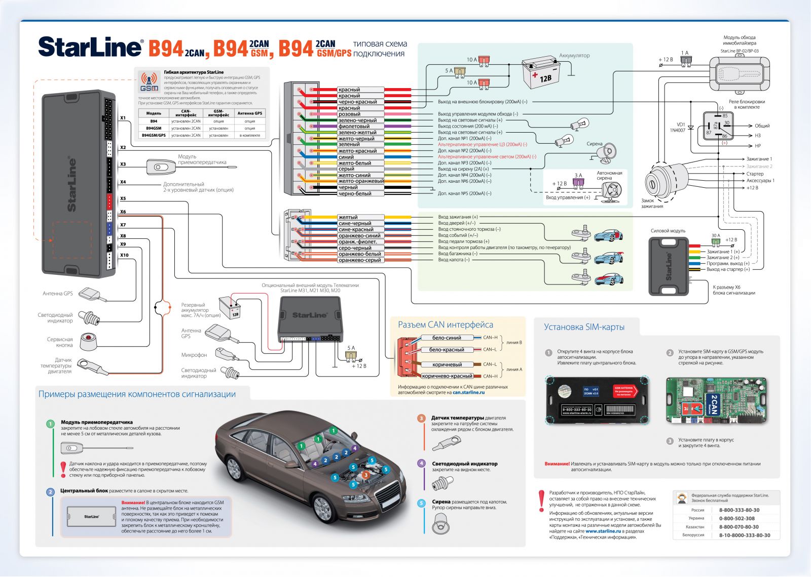 Компания StarLine зарекомендовала себя как надежного разработчика охранных систем не только для автомобилей, но и для дома. При возникновении каких-либо вопросов, касающихся работы сигнализаций StarLine B94 2CAN GSM/GPS SLAVE, вы всегда можете позвонить в федеральную службу поддержки StarLine: Россия - 8-800-333-80-30, Белоруссия, Казахстан - 8-10-8000-333-80-30, Украина - 0-800-502-308; support@starline-alarm.ru.