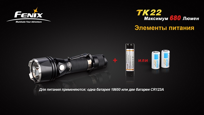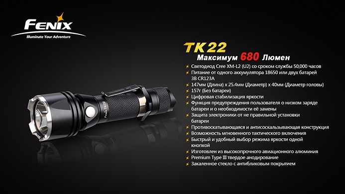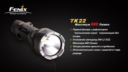 Тактический фонарь Fenix ТК22 — новинка от крупнейшего производителя фонарей, компании Fenix. Этот тактический фонарик — первая модель с текстурированным отражателем типа «апельсиновая корка», предотвращающим потерю светового потока. Всего от одного аккумулятора 18650 этот компактный фонарь даёт очень мощный световой луч.