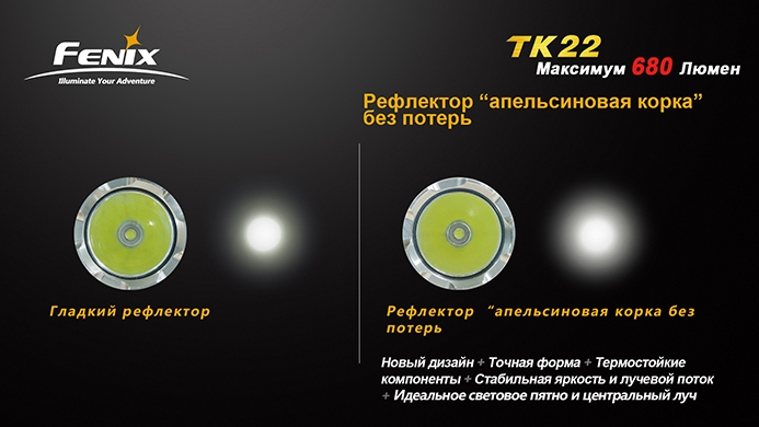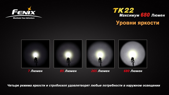 Как сказано выше, главным преимуществом модели является ультрасовременный гладкий текстурированный отражатель «апельсиновая корка». При небольшой потребляемой энергии он позволяет модели выдавать максимальную яркость в 680 люмен и световой луч длиной в 270 метров. Всего у тактического фонаря Fenix TK22 четыре режима мощности: