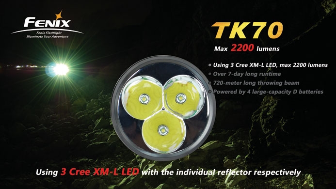 По своей конструкции сверхмощный фонарь TK70 похож на предшественника — TK60. Основное отличие заключается в гораздо более габаритной головной части, поскольку, в отличие от TK60, универсальный фонарь TK70 использует не один, а сразу три светодиода. В результате мощность фонаря почсти втрое больше — 2200 люмен против 800.
