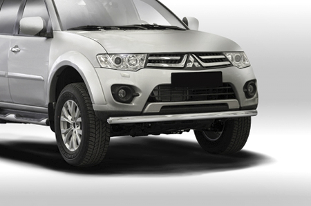 Защита переднего бампера труба предназначена для автомобилей Mitsubishi Pajero Sport от 2013 г.в. Вам не придется подгонять защиту под размеры бампера вашего авто. И с монтажом проблем не возникнет: установка защиты переднего бампера производится в штатные отверстия, а значит, необходимость сверлить кузов отпадает.