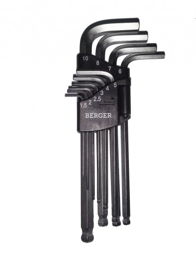 BERGER BG-10SНW — это набор шестигранников разных размеров (10 штук): от Н1,5 до Н10. Г-образные шестигранные ключи обладают шаровым профилем, благодаря которому вам очень удобно работать с крепежом под углом к его оси до 30 градусов. При этом вы можете не доставать наконечник из винта-шестигранника даже при полном обороте.