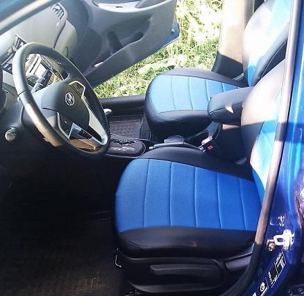 Вопросы и отзывы про Чехлы автомобильные для Hyundai Solaris, седан, от 10 г.в. (черно-синие, экокожа)