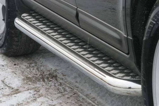 Пороги на Hyundai Santa Fe – это боковые подножки из нержавеющей стали диаметром 60 мм, которые позволяют более комфортно входить и выходить из салона автомобиля. Подножки Hyundai Santa Fe очень прочные, надежные и долговечные: они не боятся коррозии, сколов и царапин и выдерживают большие нагрузки.