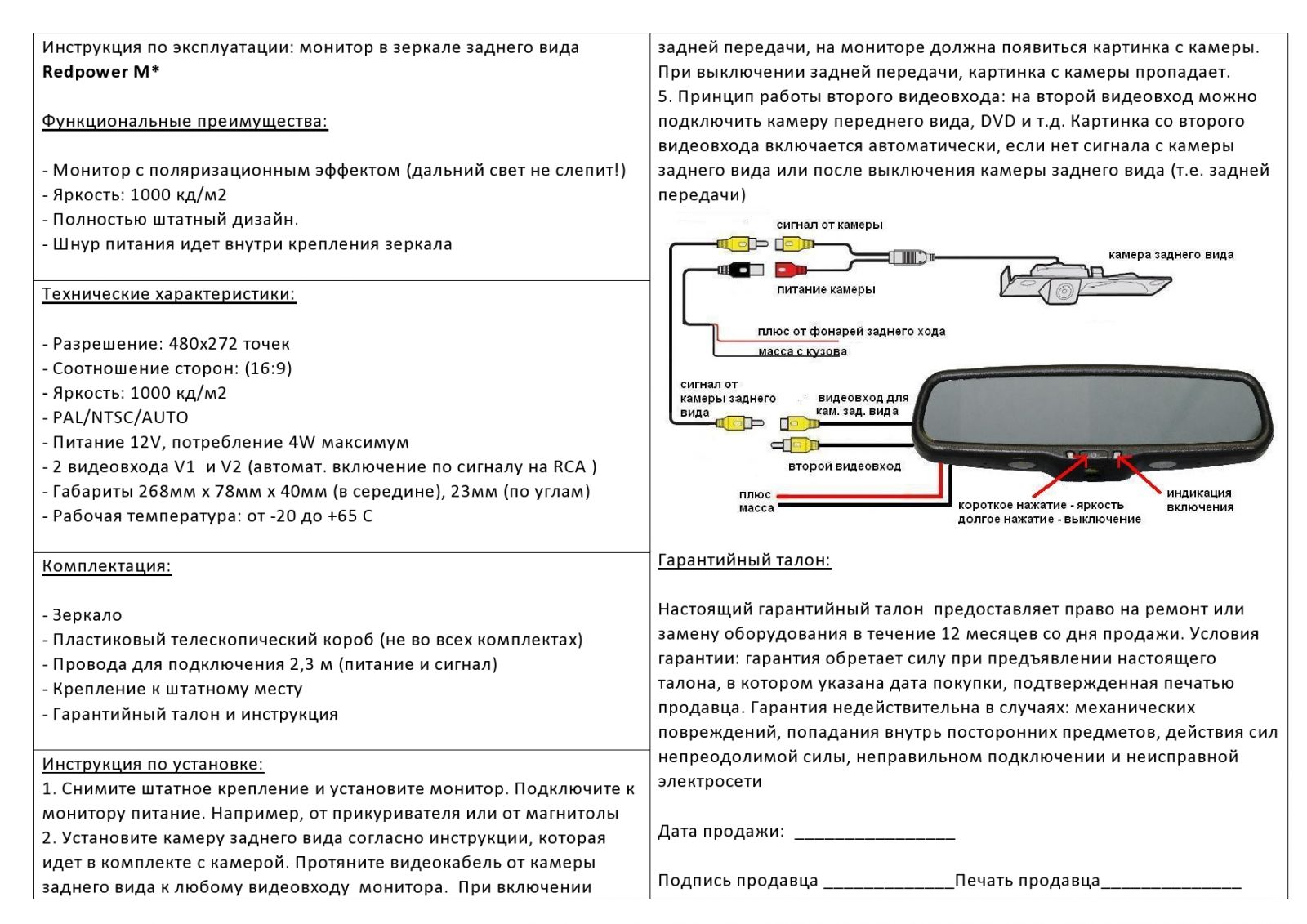 Другие особенности внутрисалонного зеркала с монитором Redpower M43 LED: