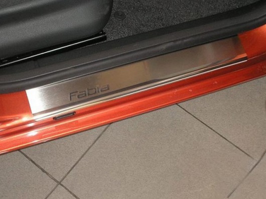 Внутренняя накладка на порог Skoda Fabia II  — это аксессуар автомобильного тюнинга, который защищает внутренний порог от механических повреждений при посадке и высадке из машины. Декоративные накладки с рисунком на внутренние пороги предназначены для автомобилей Skoda Fabia II от 2007 г.в.