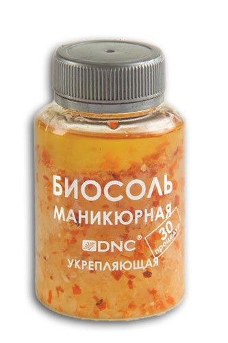 Биосоль маникюрная Укрепляющая (DNC) —  уникальное сочетание масляного комплекса и морской соли с растительными компонентами. Состав добавляется в горячую ванночку, настаивается, остывая до комфортной температуры. Ванночку принимают 10-15 минут. Общее воздействие минералов, экстрактов и масел буквально оживляет кожу рук и ногти. Залог прекрасного и беспроблемного маникюра. Содержимого хватит примерно на 30 ванночек для рук.