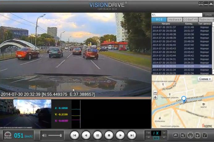 • Выносной модуль GPS (SIRF 4) определяет скорость движения и местоположение автомобиля с точными координатами. Все данные можно потом просмотреть на компьютере или ноутбуке в проигрывателе VisionDrive.