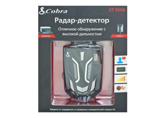 Автомобильный радар-детектор Cobra CT 5550 уверенно улавливает сигналы всех известных радарных и лазерных измерителей скорости. Не скроются от него и «неуловимые» Стрелка-СТ и Робот.