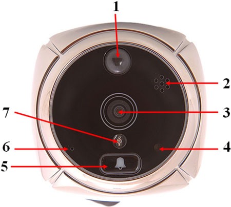 1 — ИК-датчик движения, 2 — динамик, 3 — видеокамера, 4 — датчик освещенности, 5 — кнока звонка, 6 — микрофон, 7 — светодиод ИК-подсветки