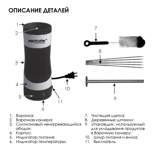Прибор внешне напоминает небольшую дорожную кружку, а работает по принципу мультиварки. Внутри есть специальная полость цилиндрической формы с антипригарным покрытием, а вокруг цилиндра находятся нагревательные элементы. Выливаете в полость пару яиц и вставляете деревянную палочку. Несколько минут и необычное блюдо — яичница на палочке — у вас в руках!