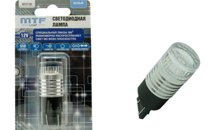 Уникальная бесцокольная светодиодная лампа MTF W21W рекордно энергоэкономична. Цвет света - желтый. Он очень яркий, однако при этом отлично воспринимается человеческим глазом. Линза 360° равномерно распространяет свет и полностью освещает площадь отражателя,  которая расположена у основания лампы.