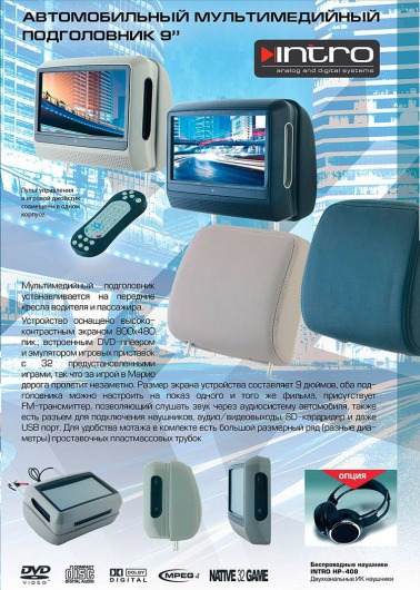 Комплект INTRO-CDH 93 – это 2 подголовника со встроенными мониторами и проигрывателями DVD, которые устанавливаются на передние кресла автомобиля. Монитор оснащен высококонтрастным экраном, имеет цифровую матрицу HD 800х480 и диагональ экрана в 9 дюймов.