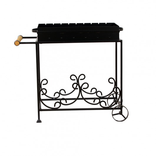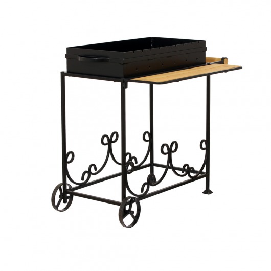 И это не единственные преимущества дачного кованого мангала МС-3. Несмотря на изящность и компактность, его конструкция отличается особой прочностью. Стойка усилена элементами ручной ковки, а ящик мангала изготовлен из цельного листа жаростойкой стали толщиной 2 мм на гидравлическом прессе. Такая жаровня выдерживает высокие температурные нагрузки в течение долгого времени и не деформируется. А спереди жаровни расположился удобный деревянный столик, который можно использовать как подставку для посуды или вместо разделочной доски.