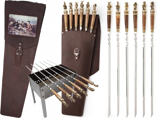 Все шампуры хранятся в оригинальном чехле из натуральной кожи, который украшен репродукцией знаменитой картины Перова "Охотники на привале" и внешне напоминает колчан для стрел.